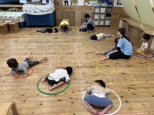 そしてこれは、おやすみりすちゃん。りすちゃんになり切って、フープのおうちで寝たり、起きて走り回ったり。これも音楽によって表現を変化させます。