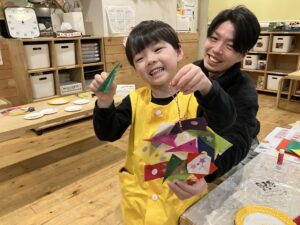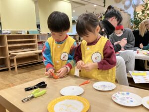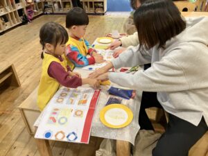 折り紙でクリスマスリースを作りました。難しいところは保護者に手伝ってもらいましたが、最近お気に入りの折り紙を使った制作に意欲的な子どもたちでした。