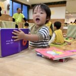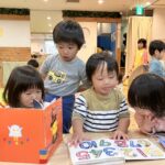 お気に入りの絵本を集中して読む姿が見られ、賑やかなフロアの中でも絵本は子どもたちにとって落ち着ける空間になっています。